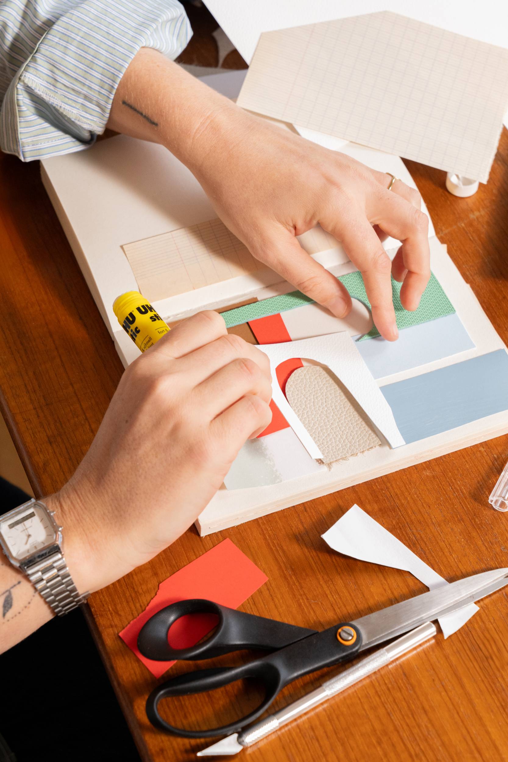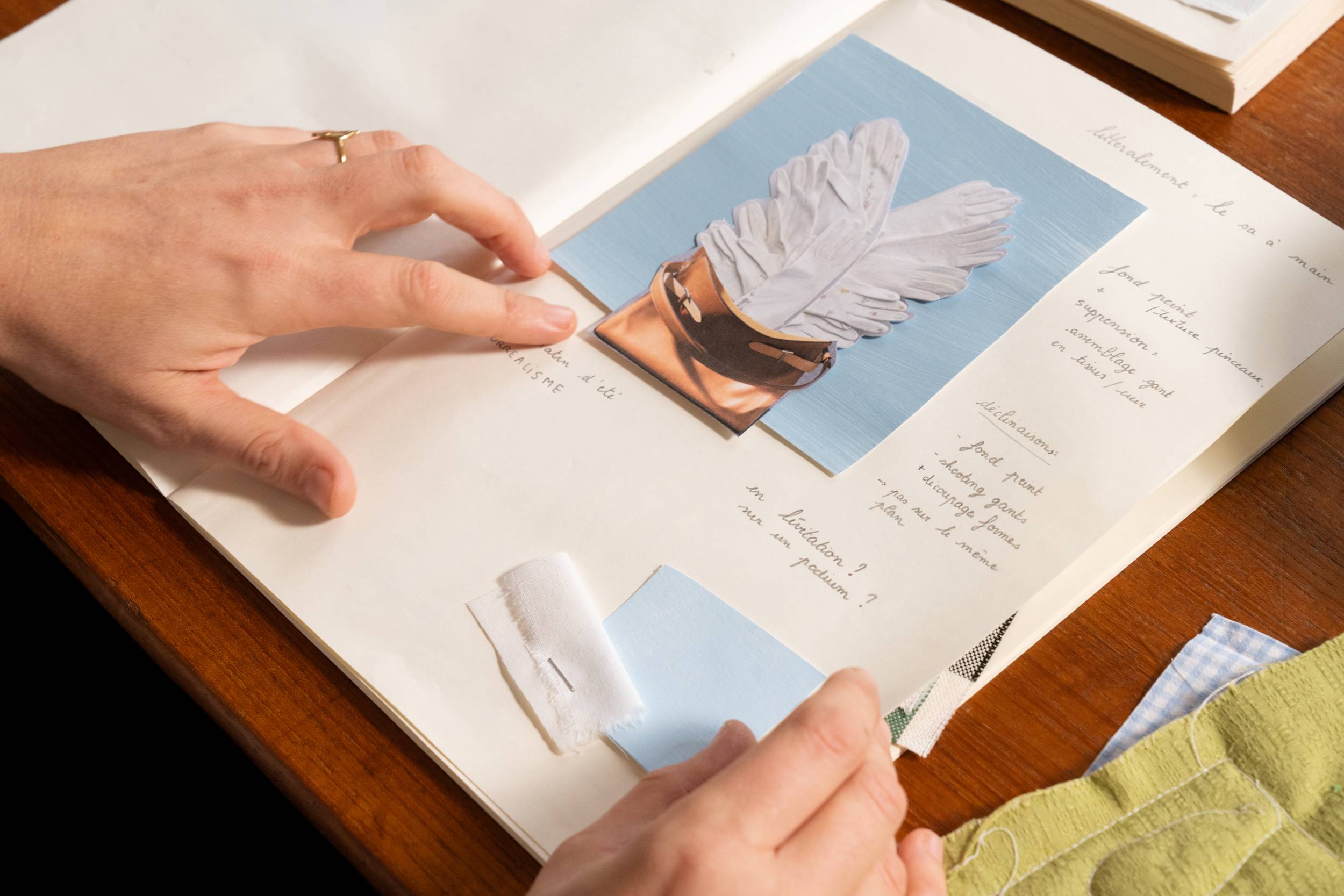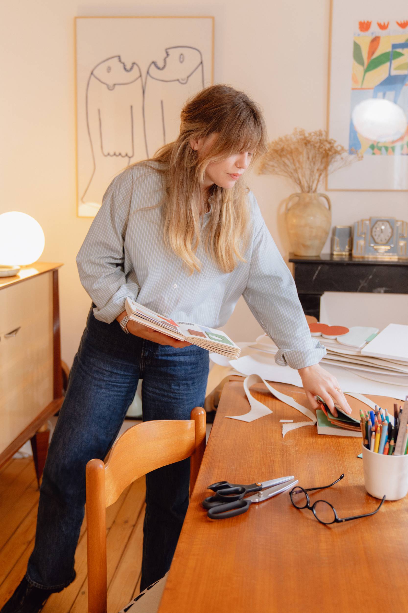 En matière de créativité, la vie quotidienne est un formidable point de départ. Là où nous fabriquons des pièces de maroquinerie, la plasticienne nantaise Amélie Dubois imagine plutôt de la poésie visuelle. À travers ses collages, la fondatrice de Maison Moche se plaît à transformer les “petits riens” du quotidien en images sensibles. Habitudes, objets, gestes et souvenirs deviennent l’essence même de son travail. Nous lui avons proposé de troquer, le temps d’un projet, son support de prédilection — le papier — pour des chutes de cuir colorées, afin de réaliser des œuvres destinées à nos vitrines. Dans son atelier, nous lui avons posé quelques questions sur cette collaboration et sur cette nouvelle façon de faire dialoguer le cuir avec le quotidien.