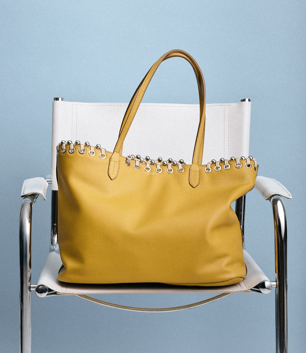 En partant d’un stock dormant, on ne choisit pas la couleur. Et ce sont souvent les couleurs les moins faciles à travailler. Par exemple, le jaune Rotin que nous voulions rendre plus lumineux. Nous avons réalisé beaucoup de tests. Quelle couleur ou quel métal pouvait le sublimer au mieux : du doré ? De l’argenté ? Nous avons fait pareil avec le Rose, réveillé avec un bleu pop et du métal argenté. Quant au gris, c’est une couleur facile à travailler, on a eu moins besoin d’ajouter une touche pop.