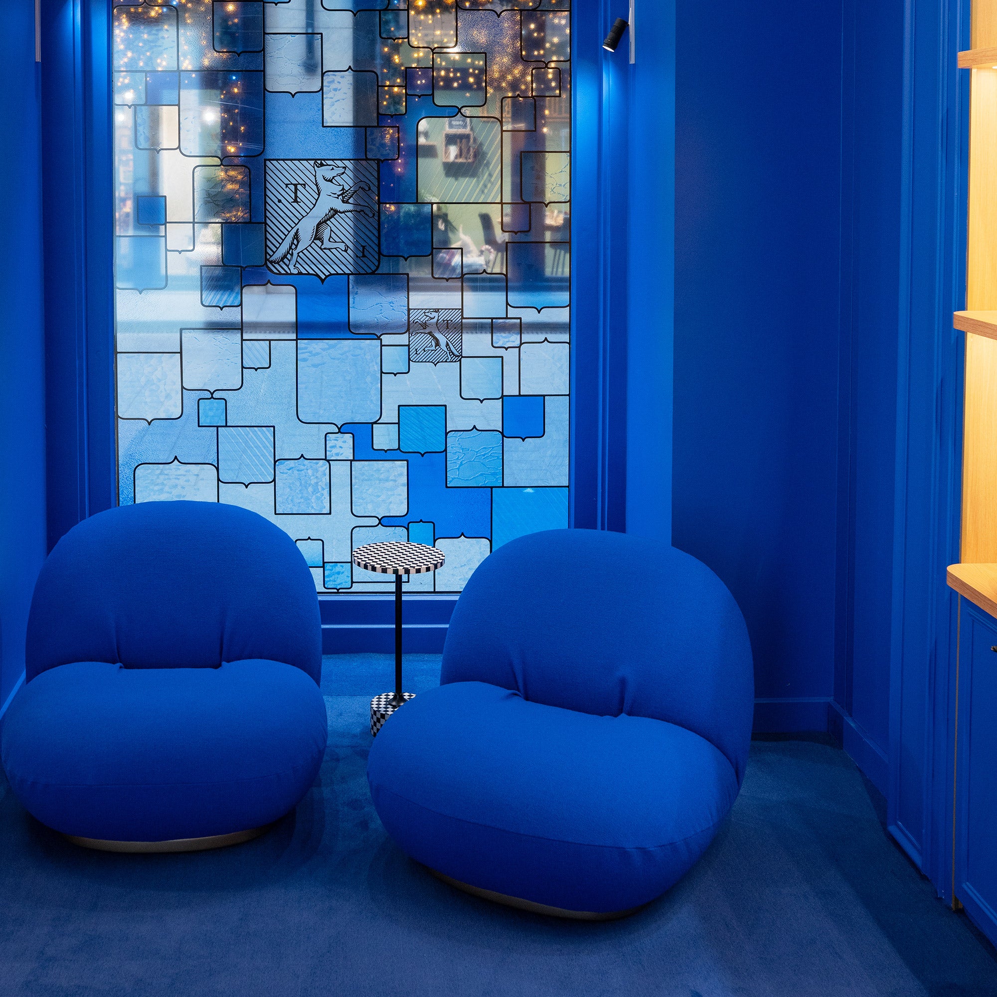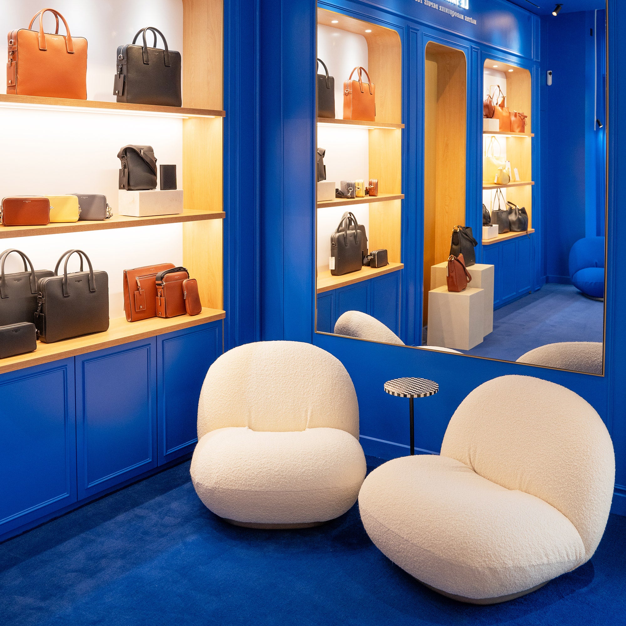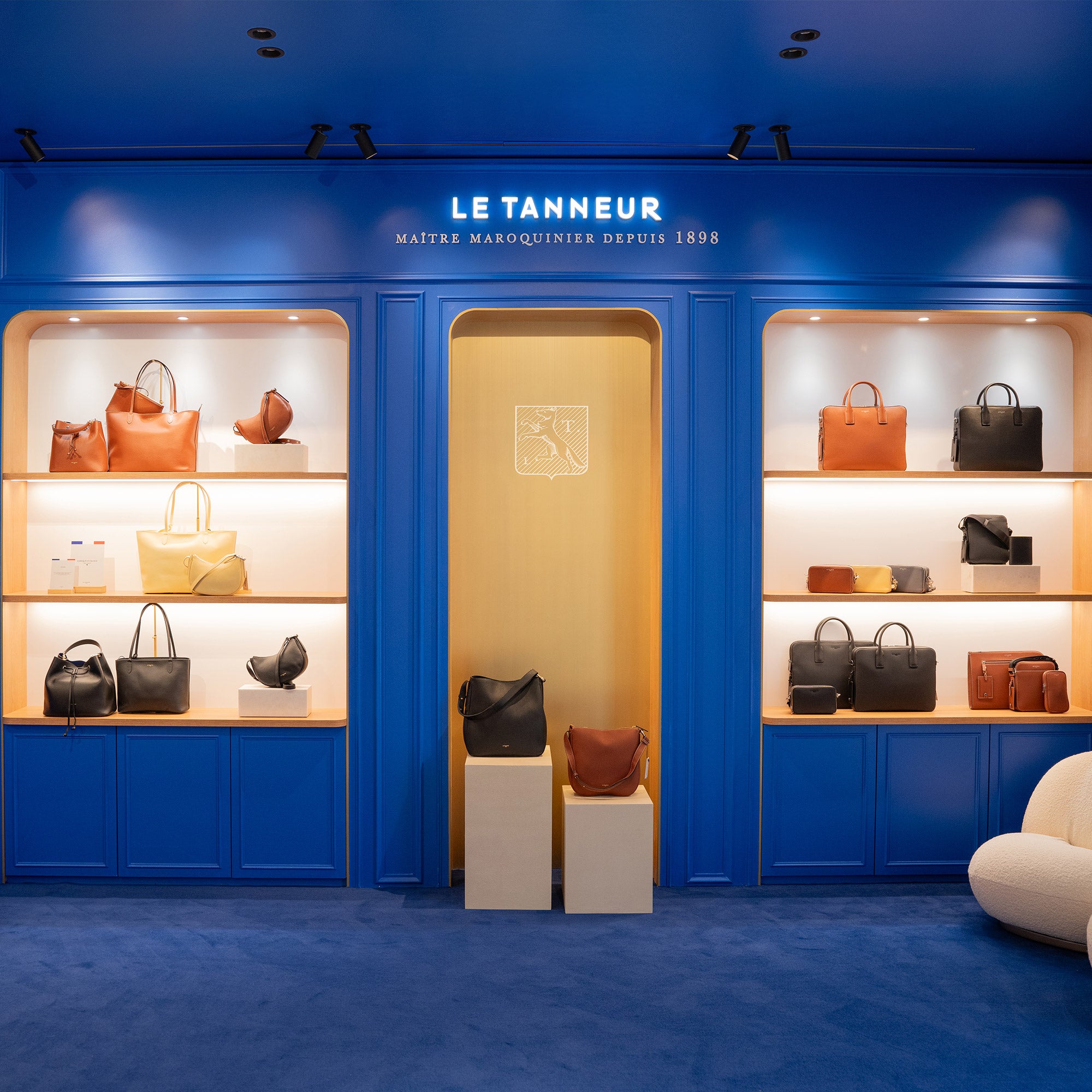 A bold space where walls, floors and ceilings are all finished in Le Tanneur's iconic blue. This "Blue Box" has been designed to immerse visitors in a monochrome environment that reflects the brand's visual identity.