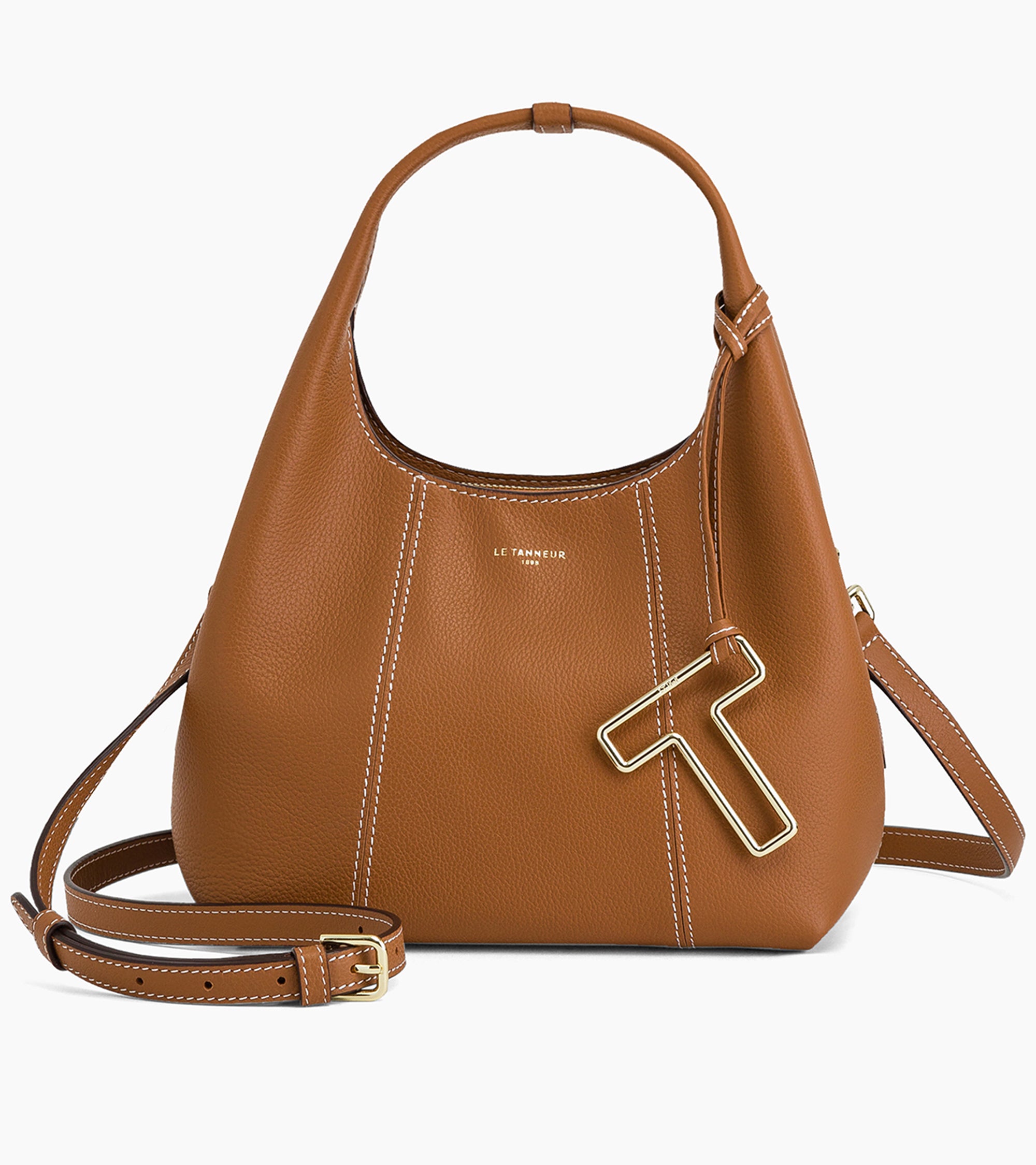 The minimalist design and sophisticated details, including the integrated handles and T-shaped metal charm, underline its distinctive look.